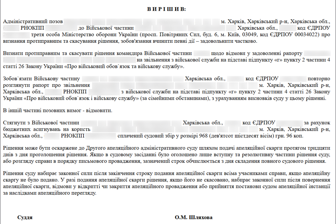 Таким чином, права нашого Клієнта було захищено та останній отримав законну можливість звільнення з військової служби за сімейними обставинами.