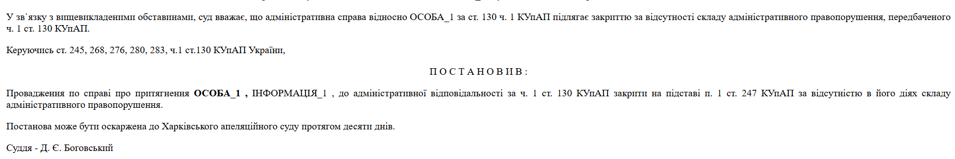 Провадження у справі було закрито за п. 1 ч. 1 ст. 247 КУпАП — у зв’язку з відсутністю події та складу адміністративного правопорушення.