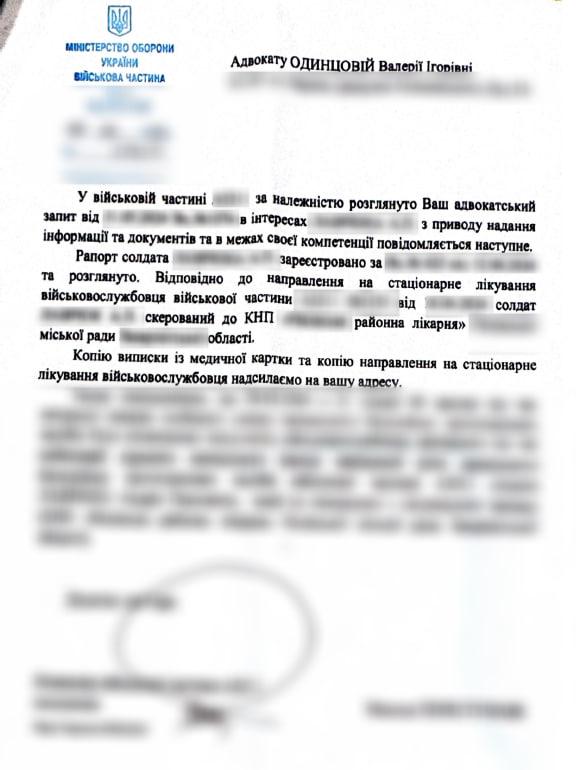 Нижче наводимо фотокопію відповіді від військової частини (персональні дані приховано), яка підтверджує успішний розгляд нашого звернення та направлення бійця до лікарні.