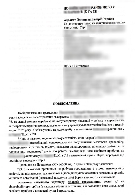 - На основі цих доказів було оперативно складено офіційне “Повідомлення про неможливість прибуття” на ім’я керівника відповідного ТЦК та СП.