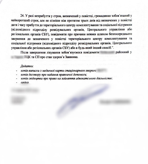 - Відповідно до вимог законодавства (зокрема, п. 24 Постанови №560, що регулює порядок повідомлення), ми також включили до документа зобов’язання Клієнта повідомити ТЦК про стан свого здоров’я та узгодити візит після завершення лікування.