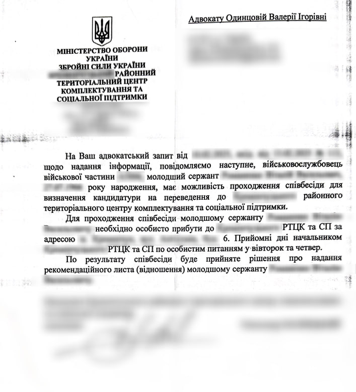 Відомості про вакансії у ТЦК та СП або інших тилових частинах не є загальнодоступними. Щоб командир діючої військової частини мав змогу розглянути рапорт про переведення, йому потрібна була конкретна підстава — так зване «відношення». Це офіційний документ від іншої військової частини, який підтверджує їхню згоду прийняти цього військовослужбовця на визначену посаду.