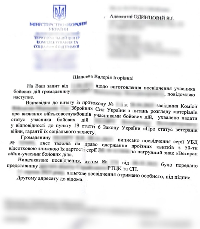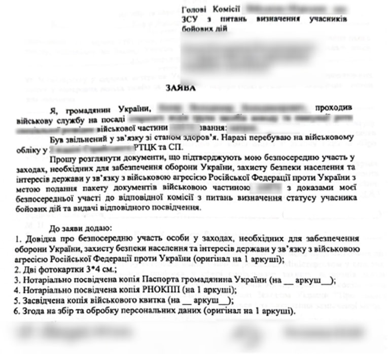 - Пакет документів було подано через відповідний ТЦК та СП до Голови відповідної Комісії ЗСУ з питань визначення учасників бойових дій.