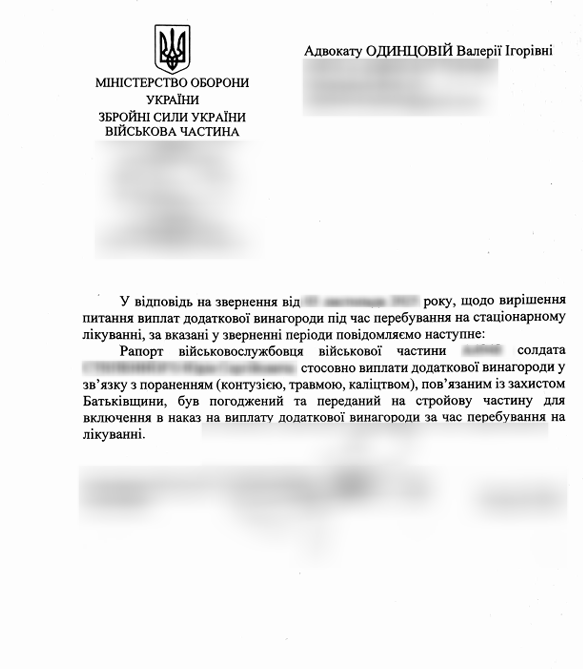 - Складено та подано адвокатський запит до військової частини з вимогою надати інформацію про наказ щодо додаткової винагороди.