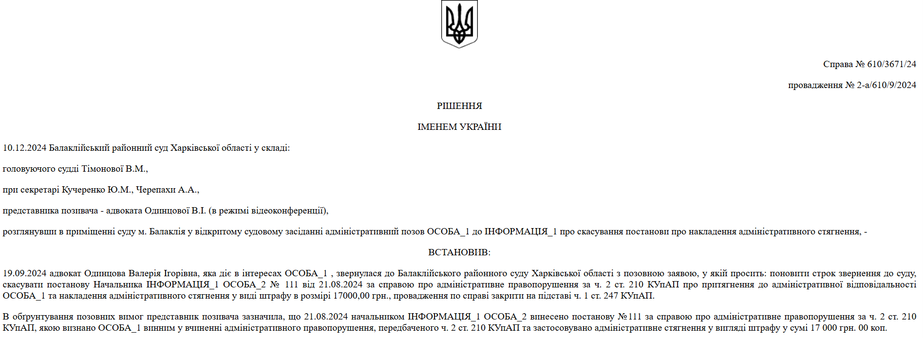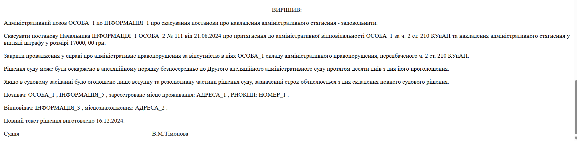 - Закрити провадження у справі через відсутність події та складу адміністративного правопорушення, передбаченого ч. 2 ст. 210 КУпАП.