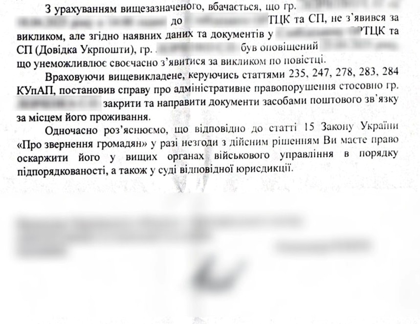 У своїй офіційній відповіді начальник обласного ТЦК та СП підтвердив, що, згідно з наявними документами, дата оповіщення Клієнта «унеможливлює своєчасну з’явитись за викликом по повістці».