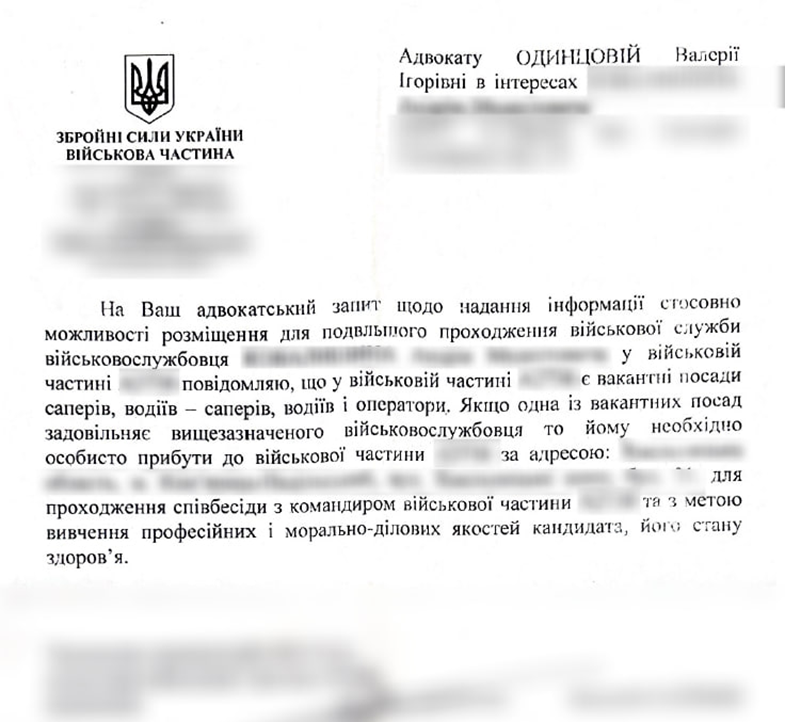 Завдяки наполегливій роботі та проактивному підходу, ми отримали позитивну відповідь від військової частини на наш адвокатський запит повідомила про наявність вакантних посад саперів, водіїв та операторів, які задовольняли вимогам ВЛК нашого Клієнта та ідеально підпадала для умов проходження подальшої служби Клієнта.