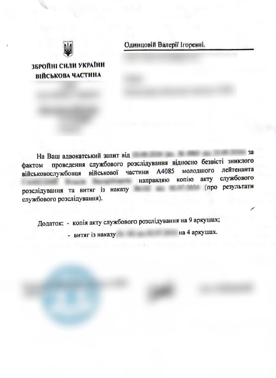 - Військової частини: З вимогою надати завірену копію Акту службового розслідування за фактом зникнення військовослужбовця та витяги з відповідних наказів.