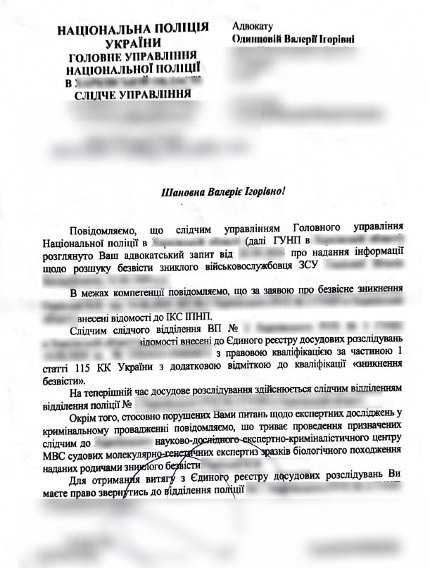 - Головного управління Національної поліції: З вимогою надати інформацію, чи зареєстровано кримінальне провадження за фактом зникнення особи та який орган проводить досудове розслідування.