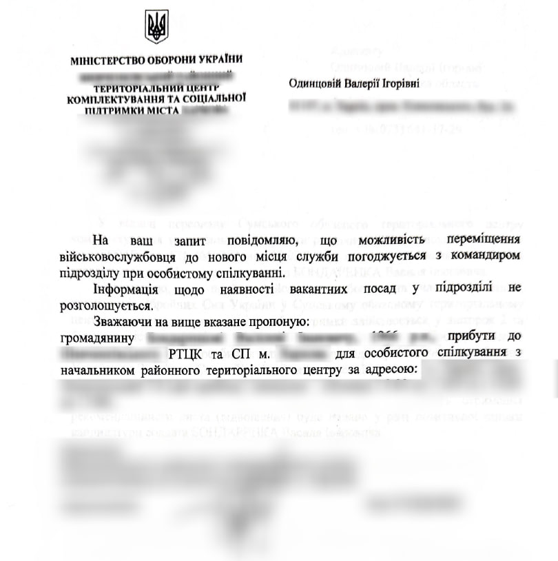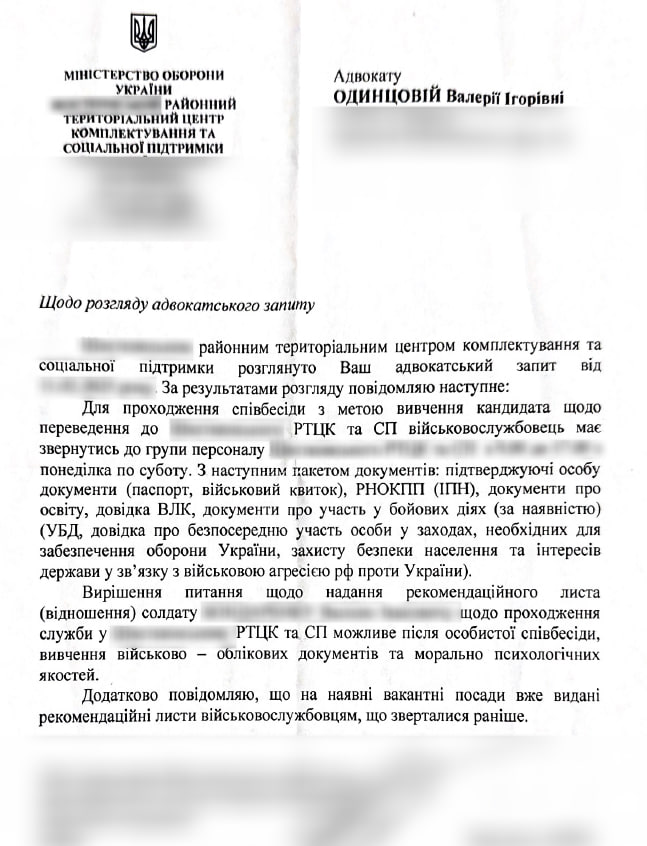 Після успішного завершення однієї з таких співбесід Клієнт отримав необхідне «відношення» для переведення. Це дало змогу подати рапорт із погодженням від нового місця служби, що зрештою дозволило успішно перевести його з бойового підрозділу на посаду в районний ТЦК та СП.