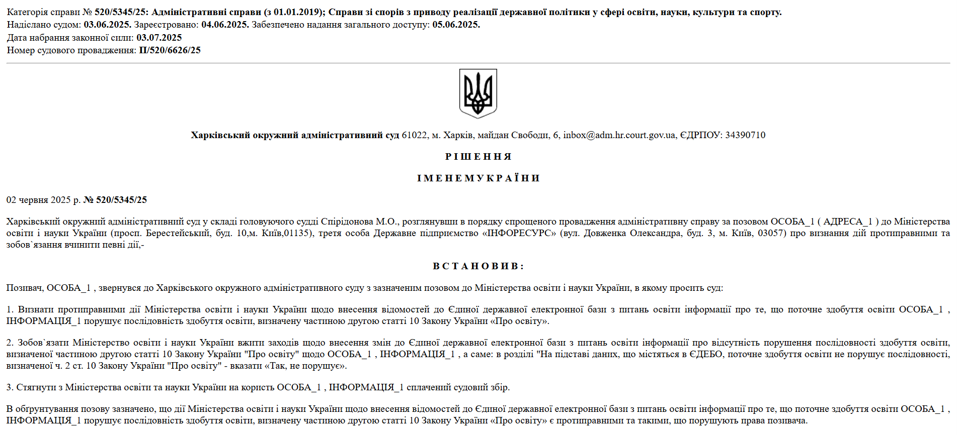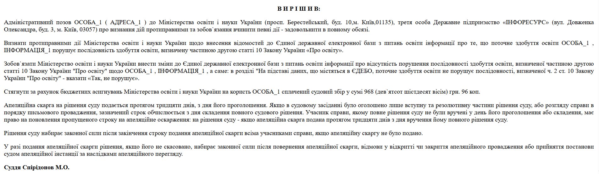 зобов’язати МОН вжити заходів щодо внесення змін до ЄДЕБО інформації про відсутність порушення послідовності здобуття освіти, визначеної ч. 2 ст. 10 Закону України “Про освіту”.