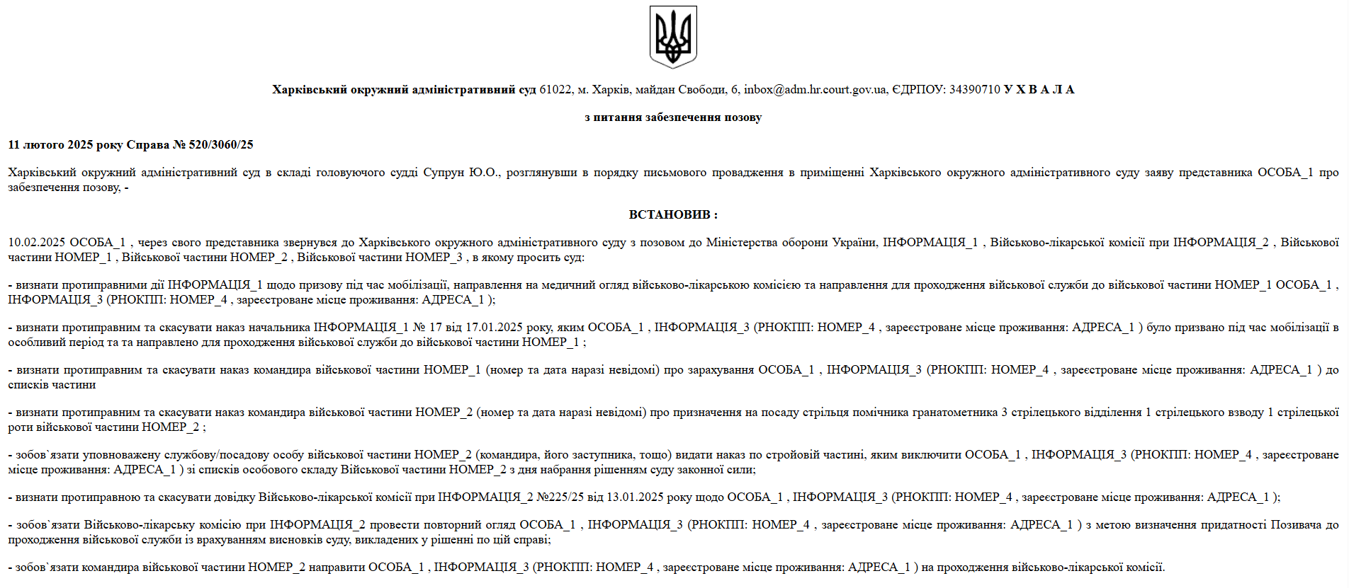 Було підготовлено ґрунтовний позов до Міністерства оборони України, ТЦК, ВЛК при МТЦК та СП та залучених військових частин із вимогами: