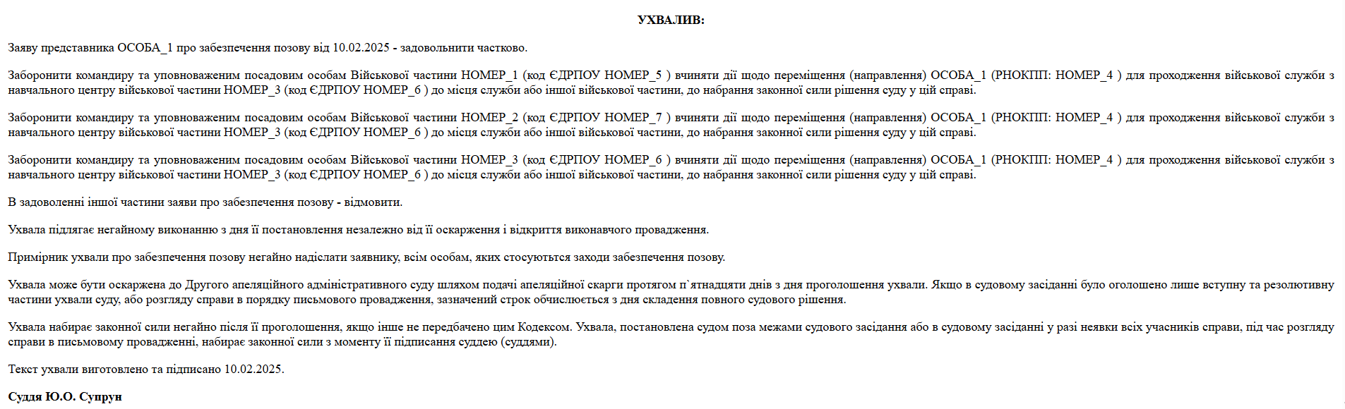 Суд, дослідивши подані нами аргументи, повністю погодився із тим, що подальше переміщення Клієнта створило б загрозу його здоров’ю, правам та можливості реалізувати судовий захист. Ухвалою було повністю заборонено переміщення Клієнта до набрання законної сили рішенням у справі.