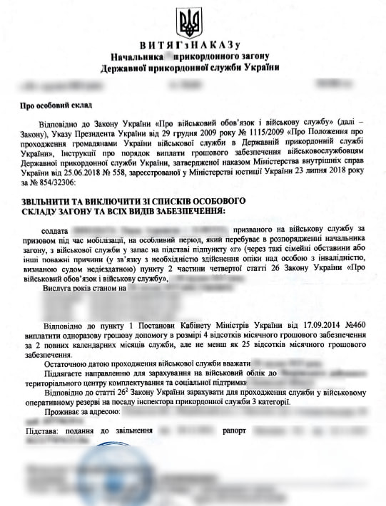 - Видано наказ начальника прикордонного загону про звільнення солдата з військової служби в запас.